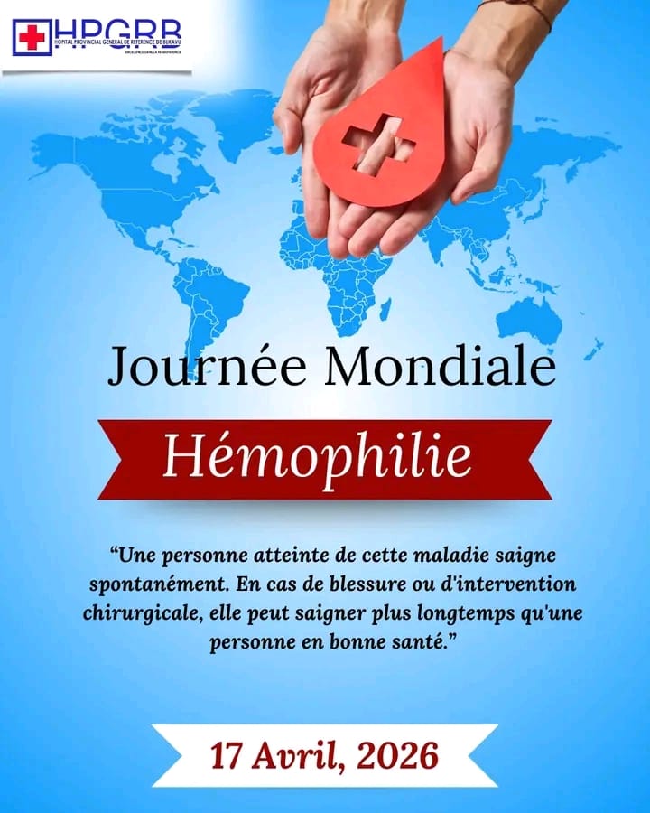À l’occasion de la Journée mondiale de l’hémophilie, l’Hôpital Provincial Général de Référence de Bukavu réaffirme son engagement en faveur de la lutte contre les maladies hémorragiques. L’établissement s’engage à renforcer les actions de sensibilisation auprès de la population, à promouvoir le diagnostic précoce et à améliorer la prise en charge des patients atteints d’hémophilie.Il œuvre également au renforcement des capacités du personnel de santé afin d’assurer une meilleure reconnaissance et un traitement approprié de cette pathologie.